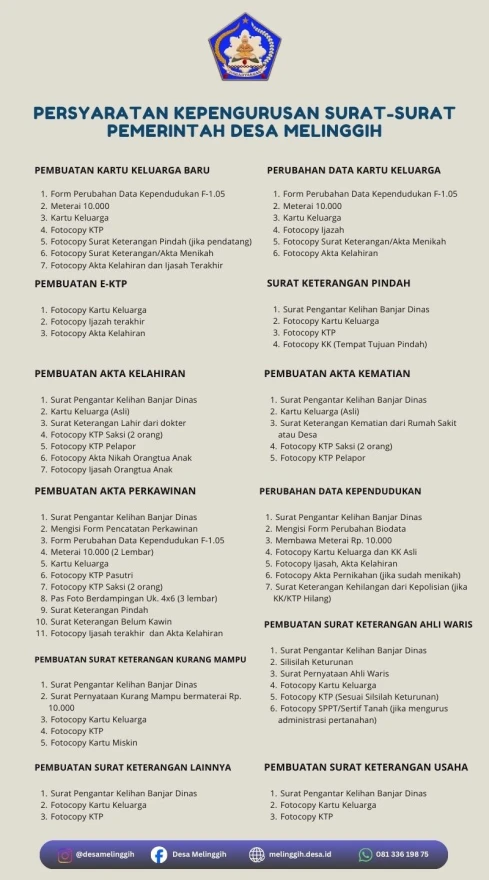 Persyaratan Administrasi Mengurus akta dan surat-surat di kantor Desa Melinggih